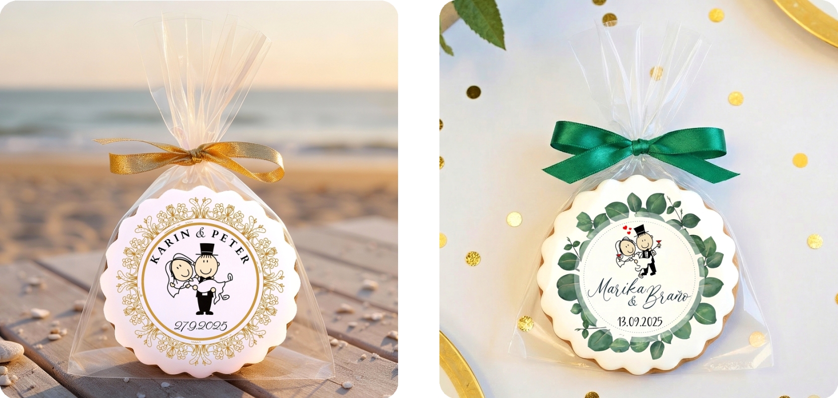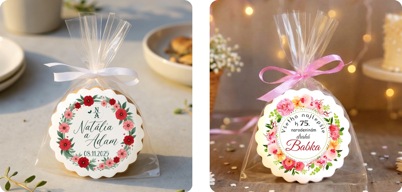 Kompletný balík zahŕňa výrobu, návrh, dizajn, jedlú potlač, obal a farebnú stužku podľa výberu. To všetko už od 1,62 € za kus