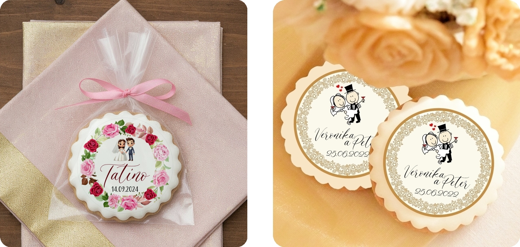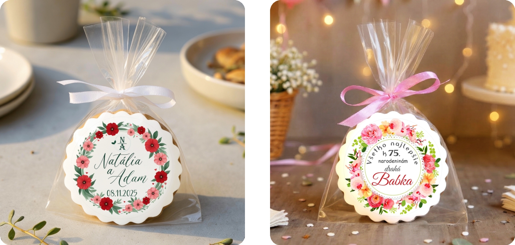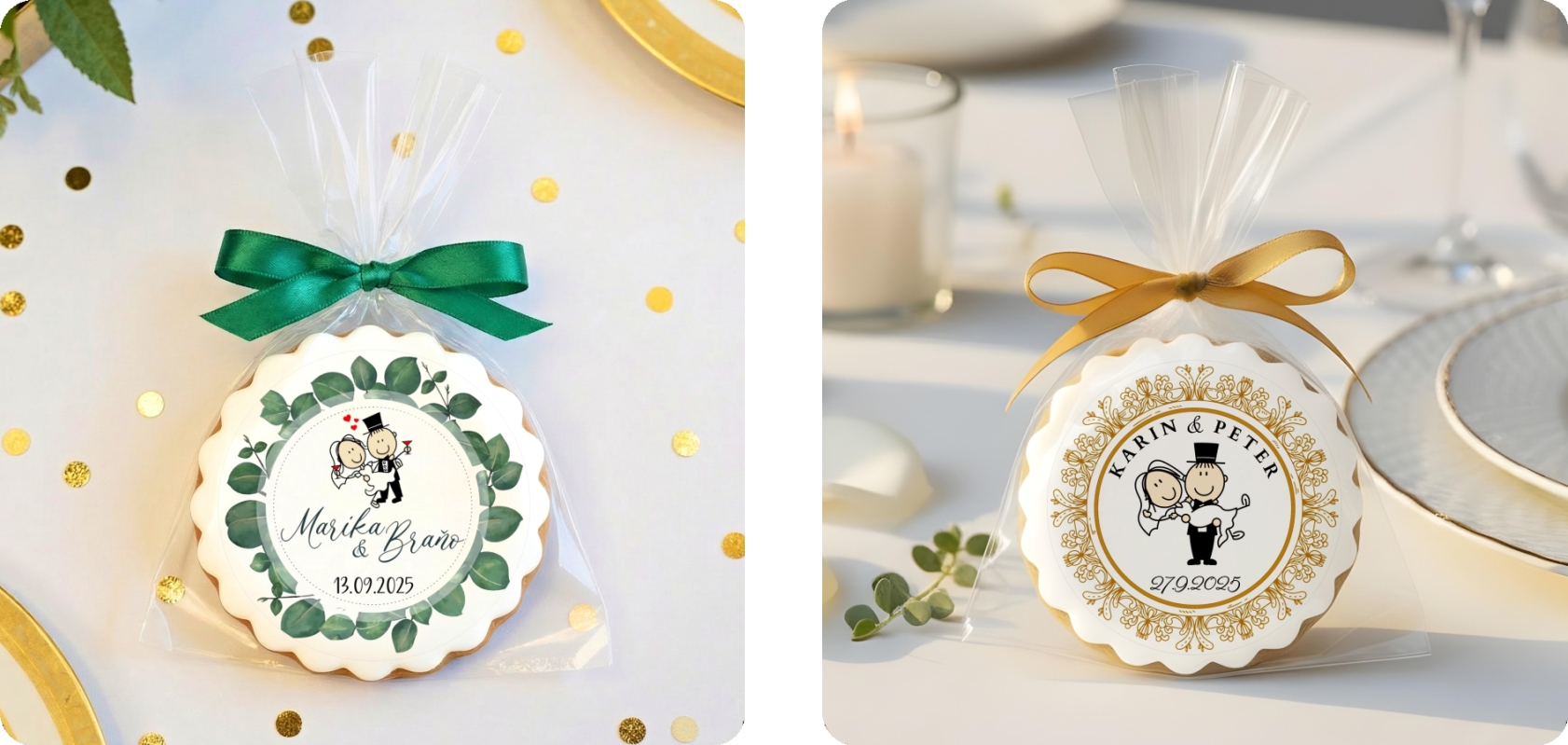Kompletný balík zahŕňa výrobu, návrh, dizajn, jedlú potlač, obal a farebnú stužku podľa výberu. To všetko už od 1,62 € za kus